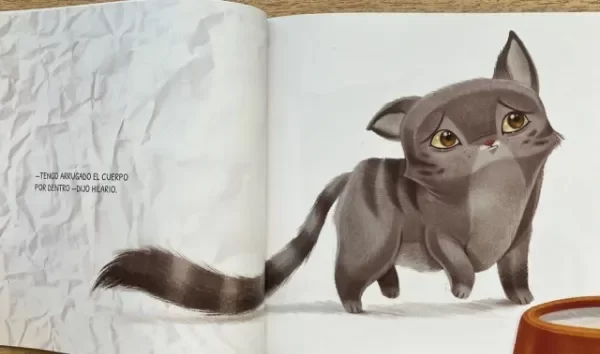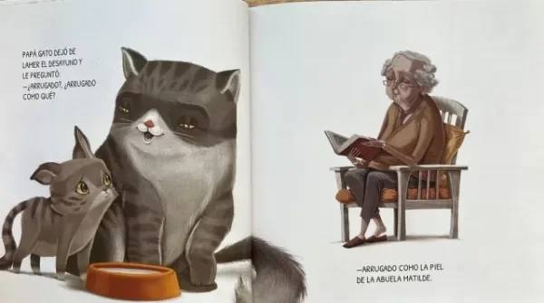 Cuando se esconde el sol, Hilario siente por dentro como si tuviera arrugas, igual que la piel de la abuela Matilde. Pero después de hablar con papá gato e investigar un poco, al amanecer salta por la ventana hacia la playa y la espuma del mar lo ayuda poco a poco a desarrugar la tristeza.