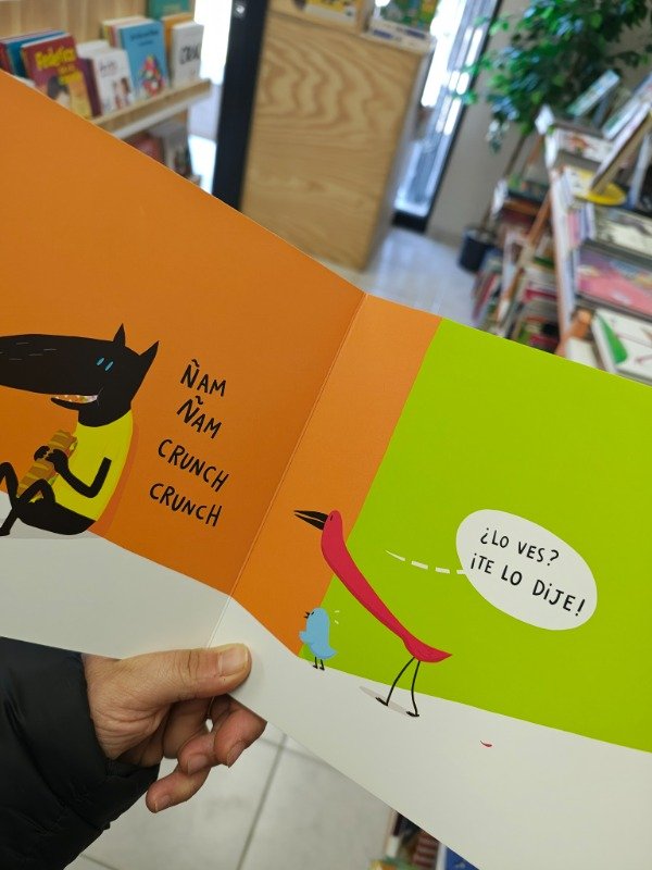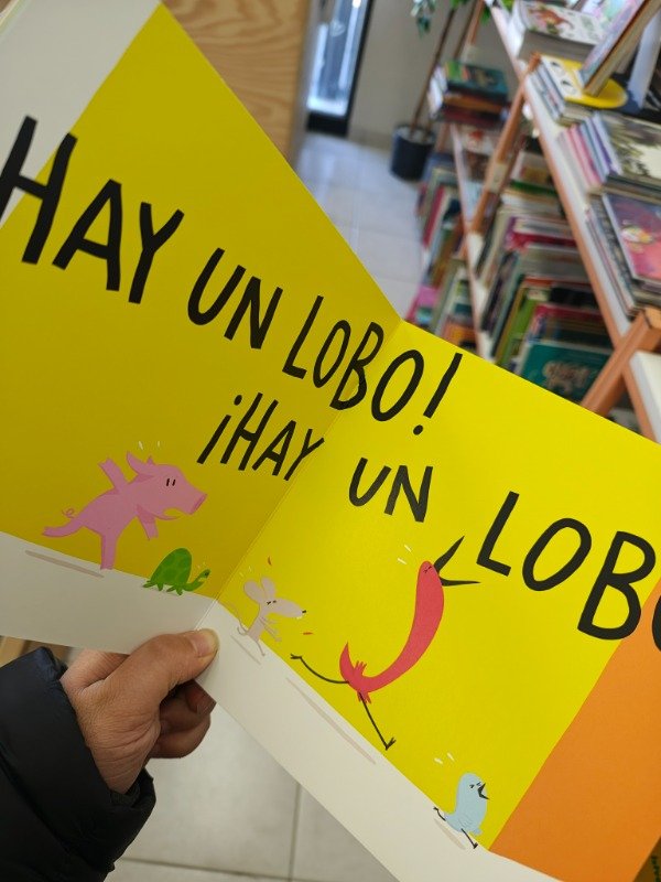 Hay un lobo! ¿Dónde? En plena calle, a la vuelta de la esquina. ¿No te lo crees? Ven a verlo. Los pájaros protagonistas advierten a sus amigos: el ratón, la tortuga, el cerdo… que se acercan a comprobarlo. El lobo están comiendo tan ricamente un bocadillo, pero a saber qué planes tendrá. Aunque intentan no asustarse, lo cierto es que están aterrorizados.