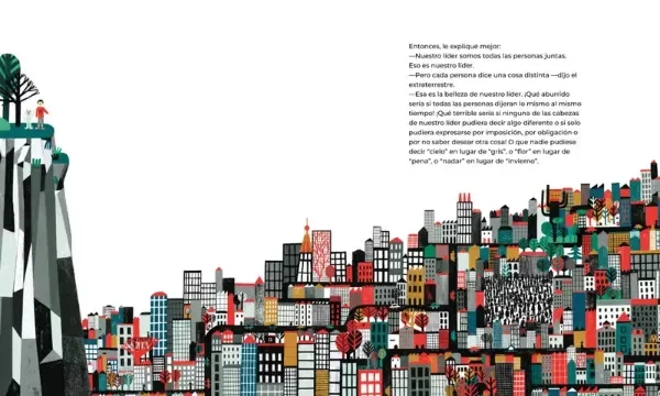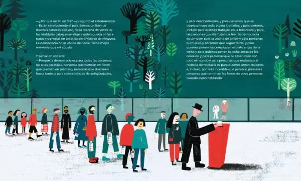 Un extraterrestre y un niño se encuentran, conversan y se hacen preguntas. De las muchas diferencias que descubren entre ellos, la que más los sorprende es la forma en que cada uno vive en su comunidad. Uno nos muestra cómo es vivir en democracia y practicarla; el otro nos habla de un líder único y de perezosos gigantes. Un diálogo potente y poético que fortalece los valores democráticos.