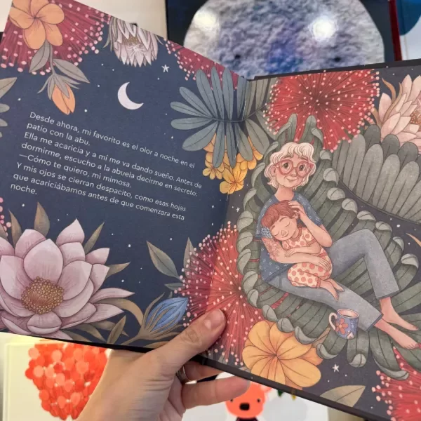Una niña pasa la noche en la casa de su abuela. Entre plantas que tienen nombre y perfume, secretos compartidos y pequeños rituales nocturnos, el relato acompaña ese momento íntimo y sensible en el que lo desconocido (la noche, dormir fuera de casa) se vuelve abrigo. Con una prosa delicada y envolvente, y un ritmo pausado, la historia celebra el vínculo entre abuela y nieta, la confianza, la ternura y el poder evocador de los sentidos.